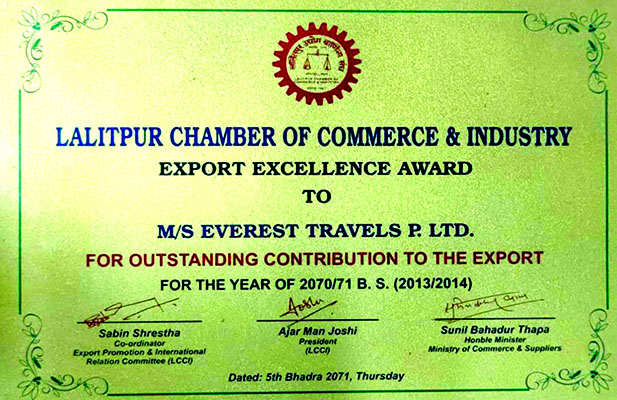 Everest Travel Service recived Export Excellence Award from Lalitpur Chamber of Commerce.